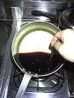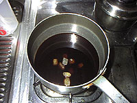 みりんは砂糖を溶かした後から入れるのが本筋だそうですが、今日は全部一緒に暖めました