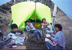 このときのテント以外の装備は、次のようなものだった。タープ1式、ランタン1台、イス4脚、テーブル1脚、小さなバーベキューコンロひとつ。煮炊きは練炭七輪とホエブス725。まだツーバーナーは無かった。食器は家で使っているもの。シュラフも持っていなかった。代わりに毛布と座布団を使った。