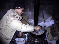 テントを設営したぼくは、すでにみんなが建てているスクリーンテント温室に入った。温室の中には渡部さんが持参してきた薪ストーブが赤外線を放出している。薬缶がシュンシュンと湯気を上げており、外の寒さを感じない。冬のキャンプは雪が外の音を吸収してしまうのと、人が少ないのとで、夏などと比べたら実に静かである。ところが、人間、暖かいところではやはり騒々しくなる。とりわけ我々の場合はそうである。だから周りに迷惑のかからない冬のキャンプが良いのである。