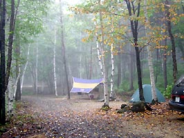 霧雨の中テントを張る